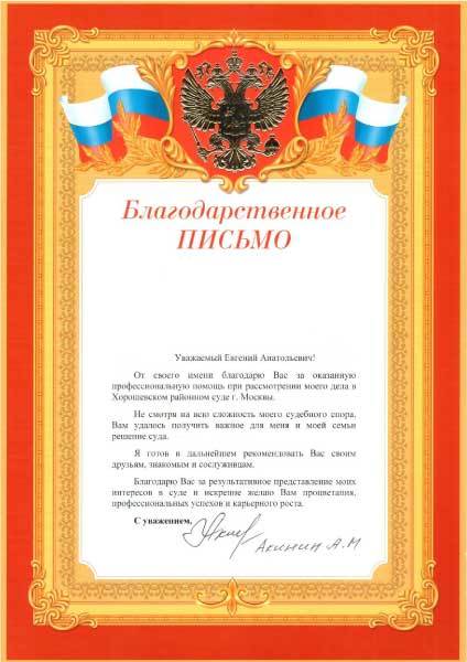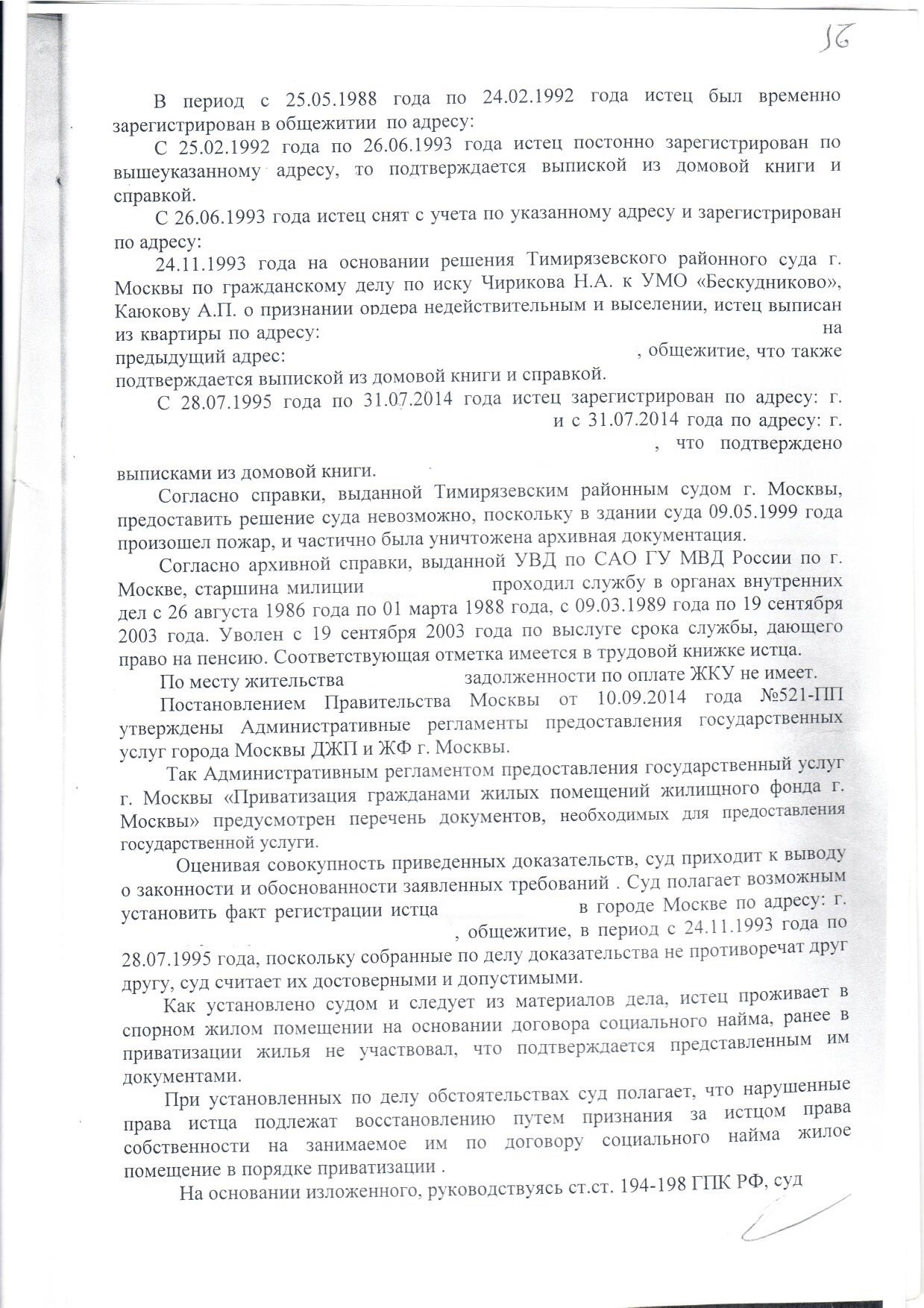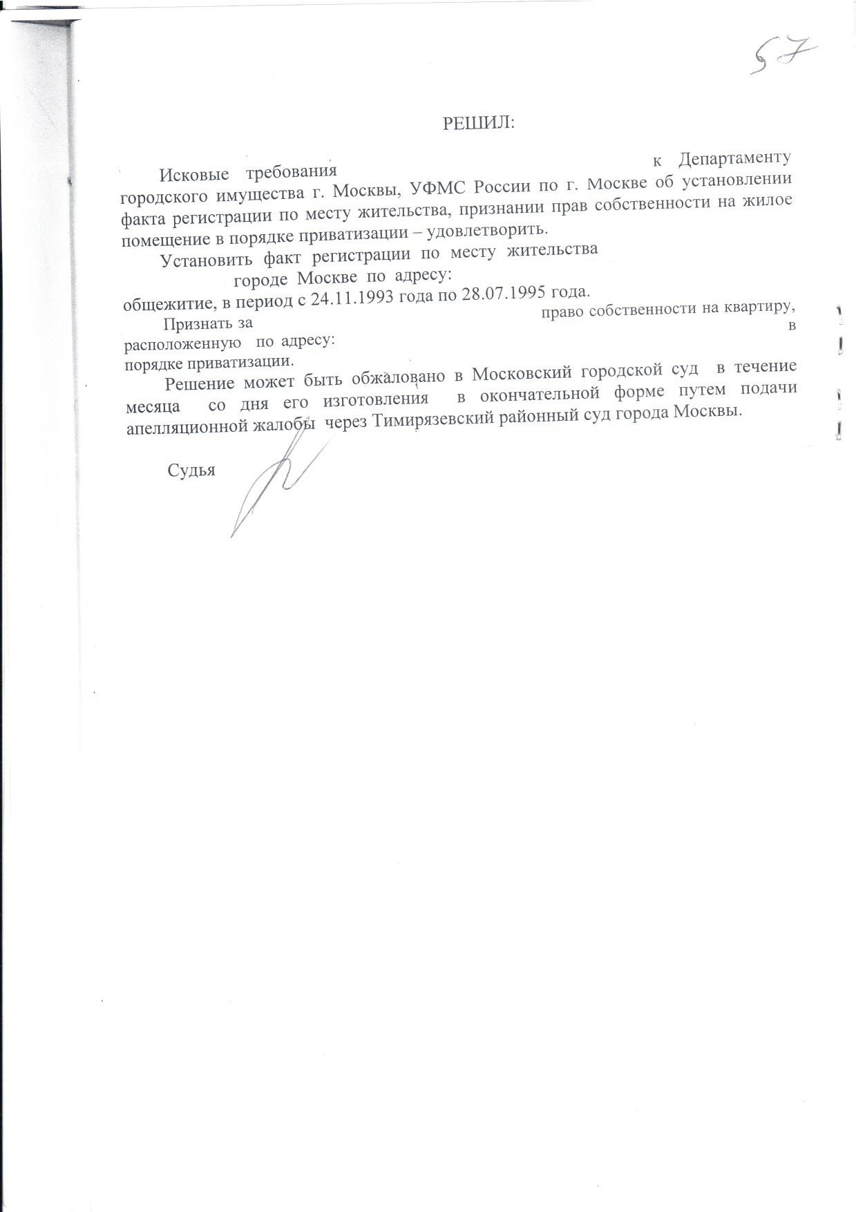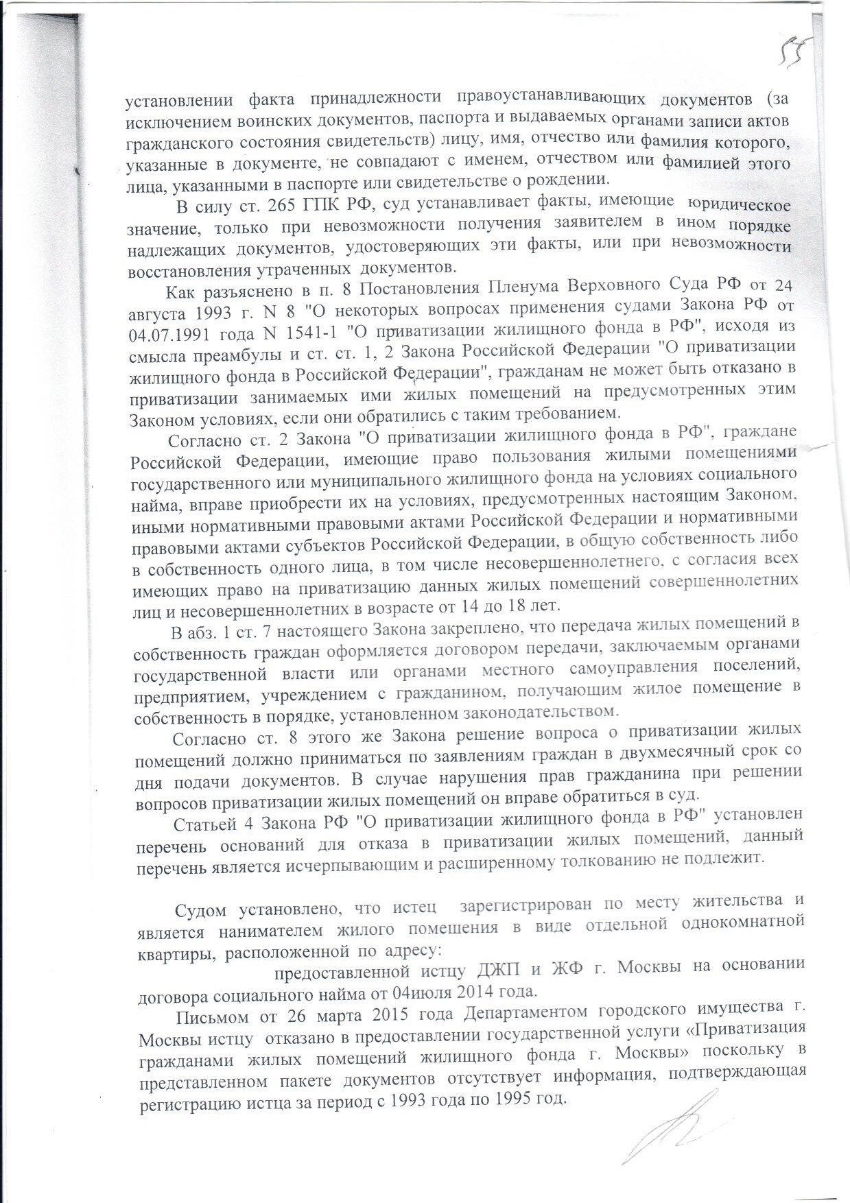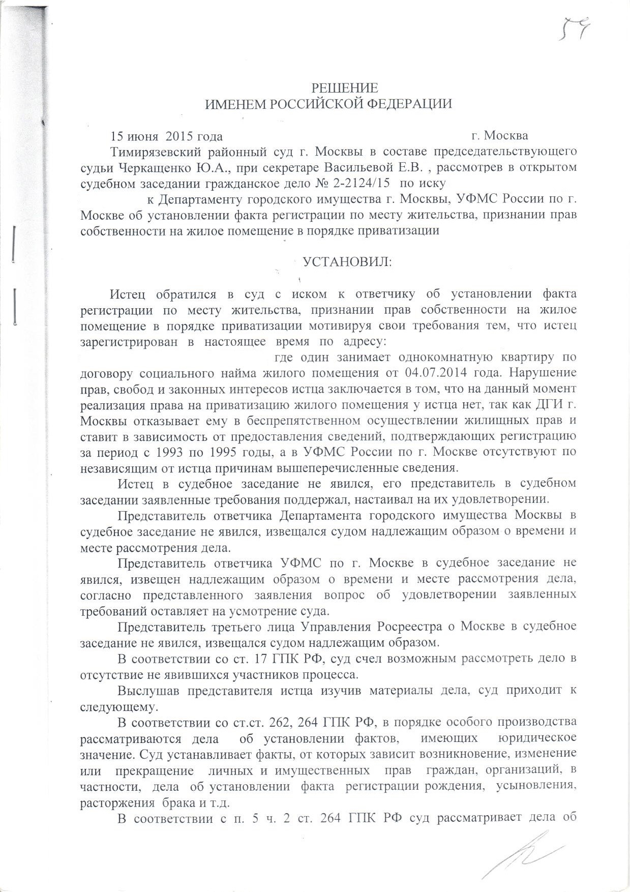 Для начала Рыжов Е.А. собрал всю доказательную базу в обосновании требований своего доверителя, потребовал установить в соответствии со ст. 264 ГПК РФ факт регистрации гр. по месту жительства в г. Москве и признать за истцом право собственности на занимаемое жилое помещение. Истец проживал в спорном жилом помещении на основании договора социального найма, ранее участия в приватизации жилых помещений не принимал, в юридически значимый период проходил службу в органах внутренних дел. Поэтому в настоящее время нет никаких препятствий к приватизации данного объекта со стороны Федерального законодательства. Статья 35 Конституции РФ декларирует, что каждый гражданин вправе иметь в собственности имущество. С целью создания в России класса собственников, государство приняло закон о приватизации жилищного фонда. В соответствии со ст. 11 данного нормативного акта, гражданин может один раз бесплатно приватизировать в собственность жилье из государственного или муниципального фонда. Статья 2 этого же закона устанавливает, что гражданин, занимающий жилье на основе договора социального найма, вправе получить его в собственность.