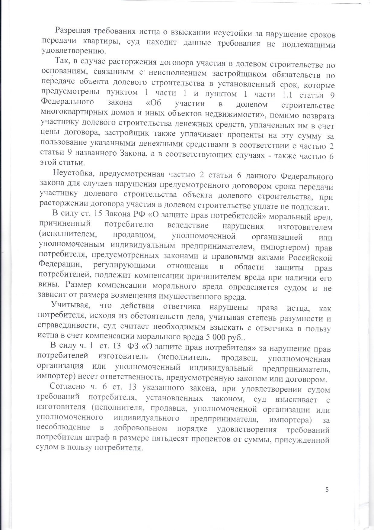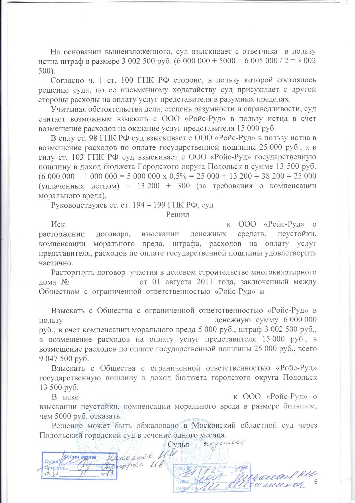 Суд удовлетворил иск. Он расторг договор участия в долевом строительстве между истцом и застройщиком, взыскал штраф, моральный вред и судебные издержки с застройщика в пользу истца.