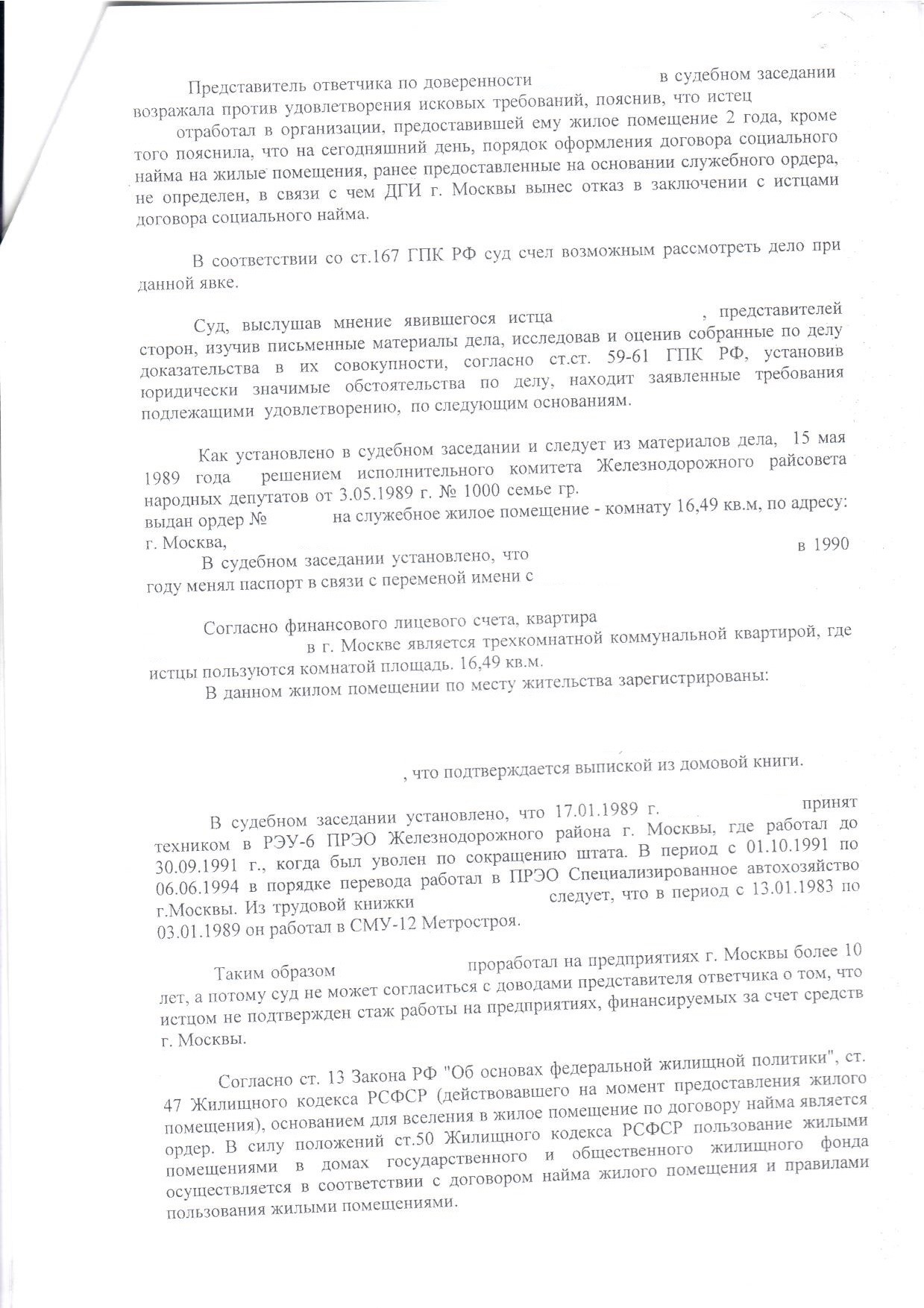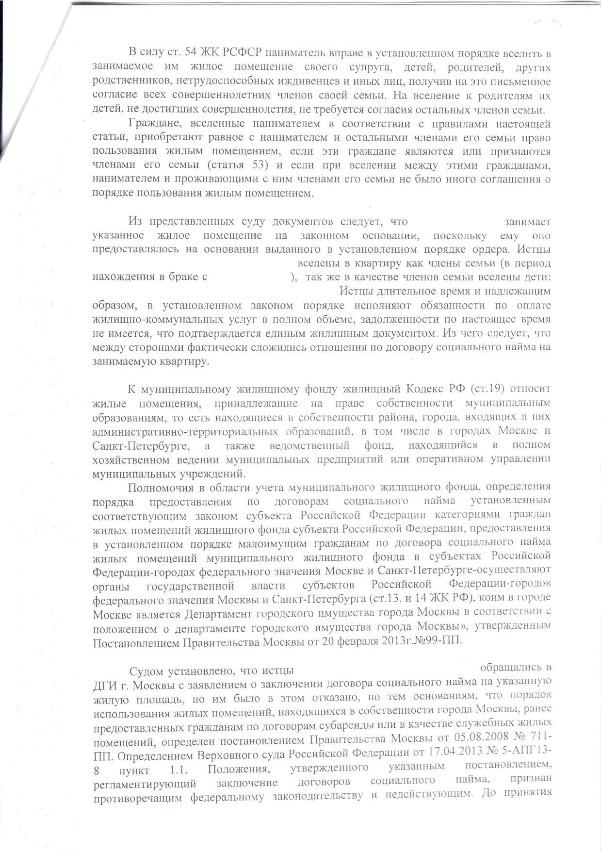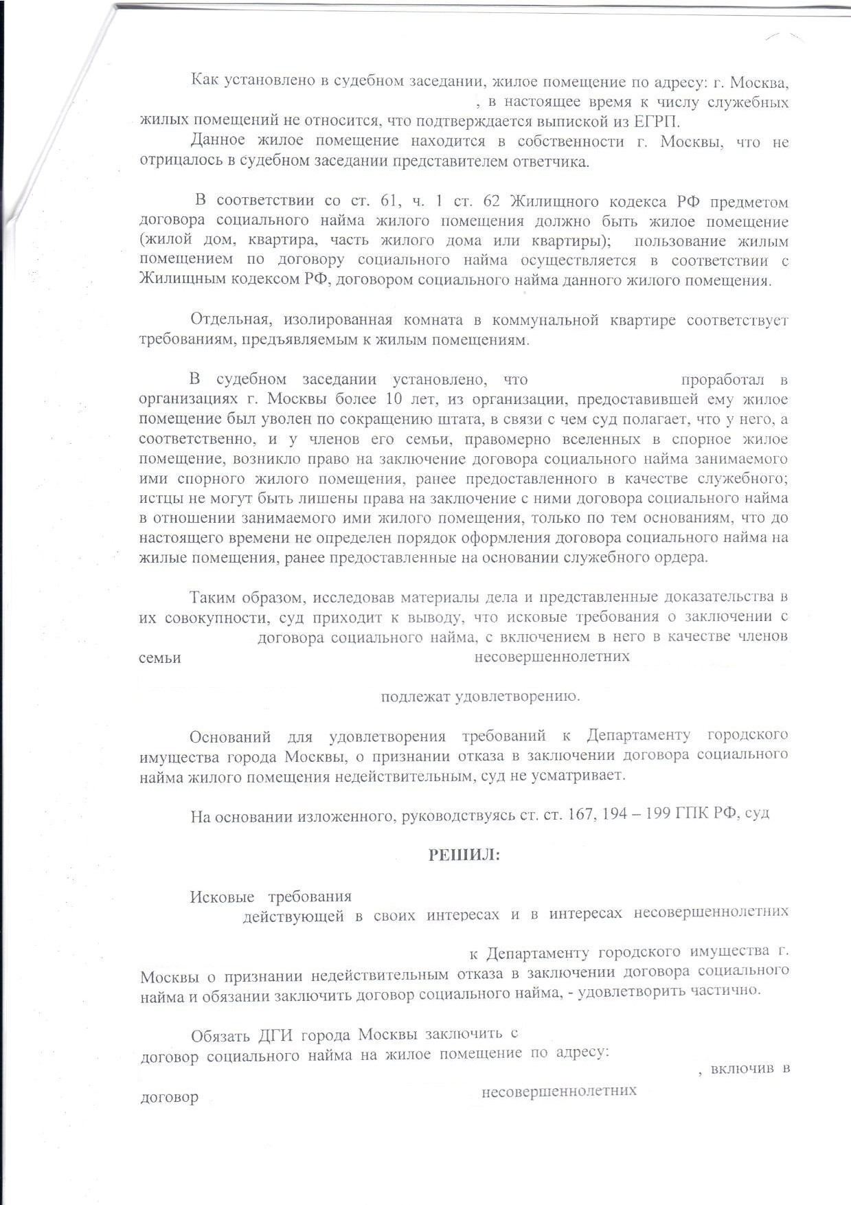 Суд удовлетворил иск. Он обязал ДГИ г. Москвы заключить договор социального найма с нанимателем квартиры, включив в него членов семьи.