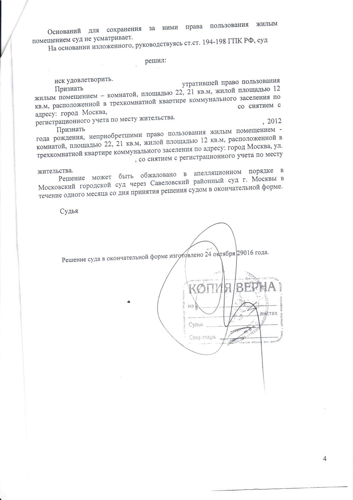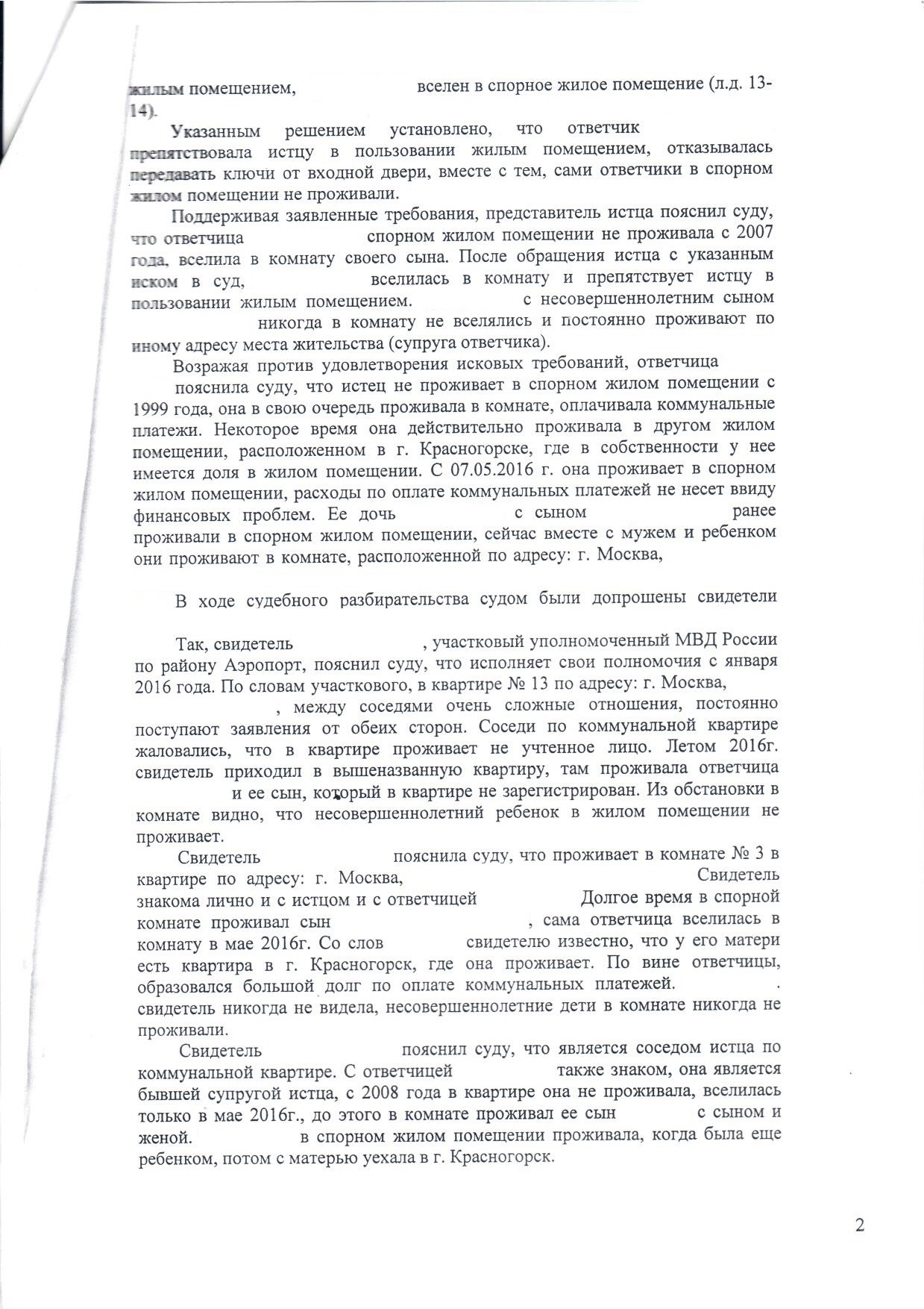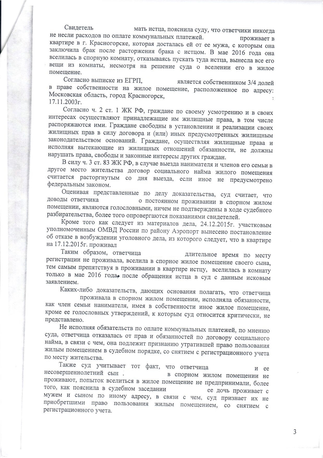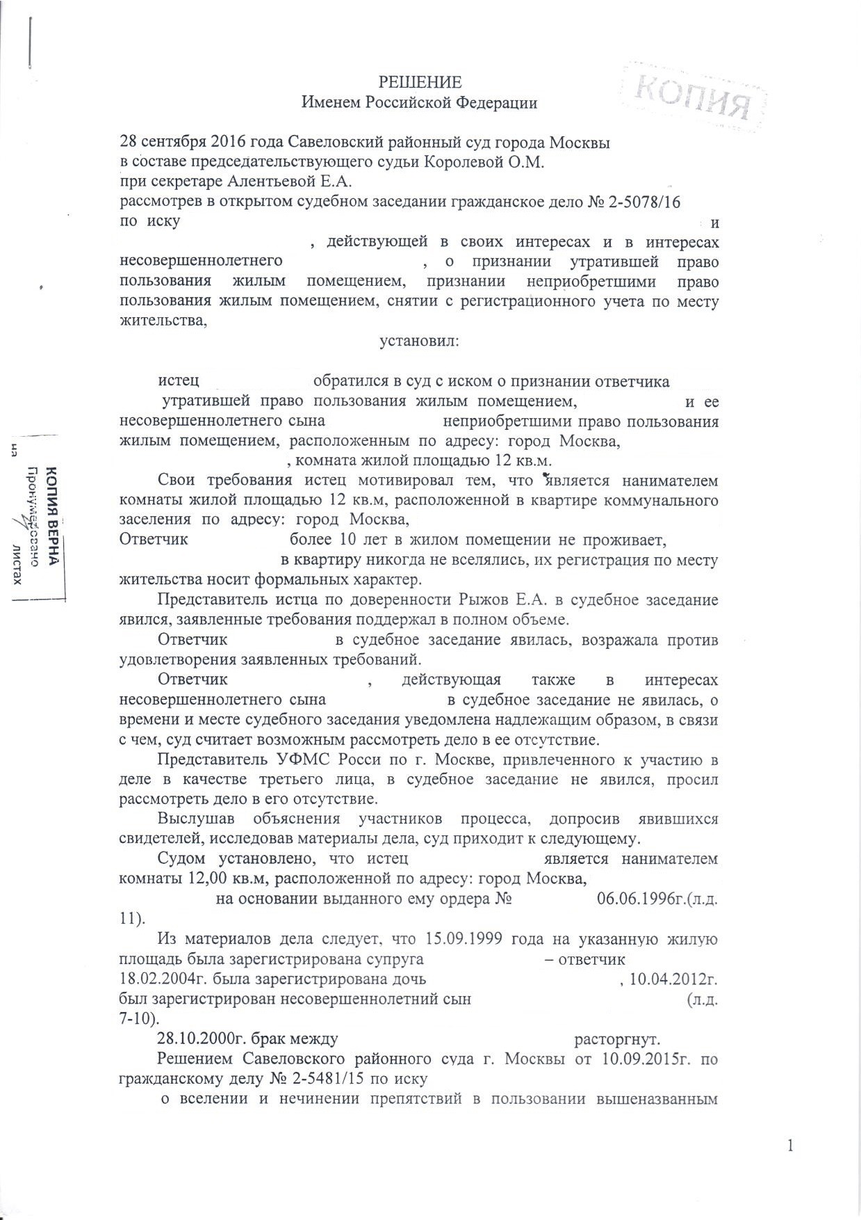 Для начала Рыжов Е.А. собрал доказательную базу в обосновании требований истца, правильно сформулировал исковые требования по делу, исходя из сложившейся судебной практики, решил признать жену бывшую утратившей право пользования жилым помещением, а дочь и внука признать неприобретшими право пользования спорным жилым помещением. С учетом письменных доказательств, показаний свидетелей соседей, юристу удалось склонить суд на свою сторону и выселить бывших родственников истца. Бывшая жена длительное время не проживала в жилом помещении, там проживал ее сын, который систематически нарушал права соседей. Дочь и внук никогда в комнату не вселялись, проживали по другому адресу. Юрист верно определил нормы материального права, на которые ссылался в своем иске, а именно на ч.2 ст. 1, ч.3 ст. 83 ЖК РФ.