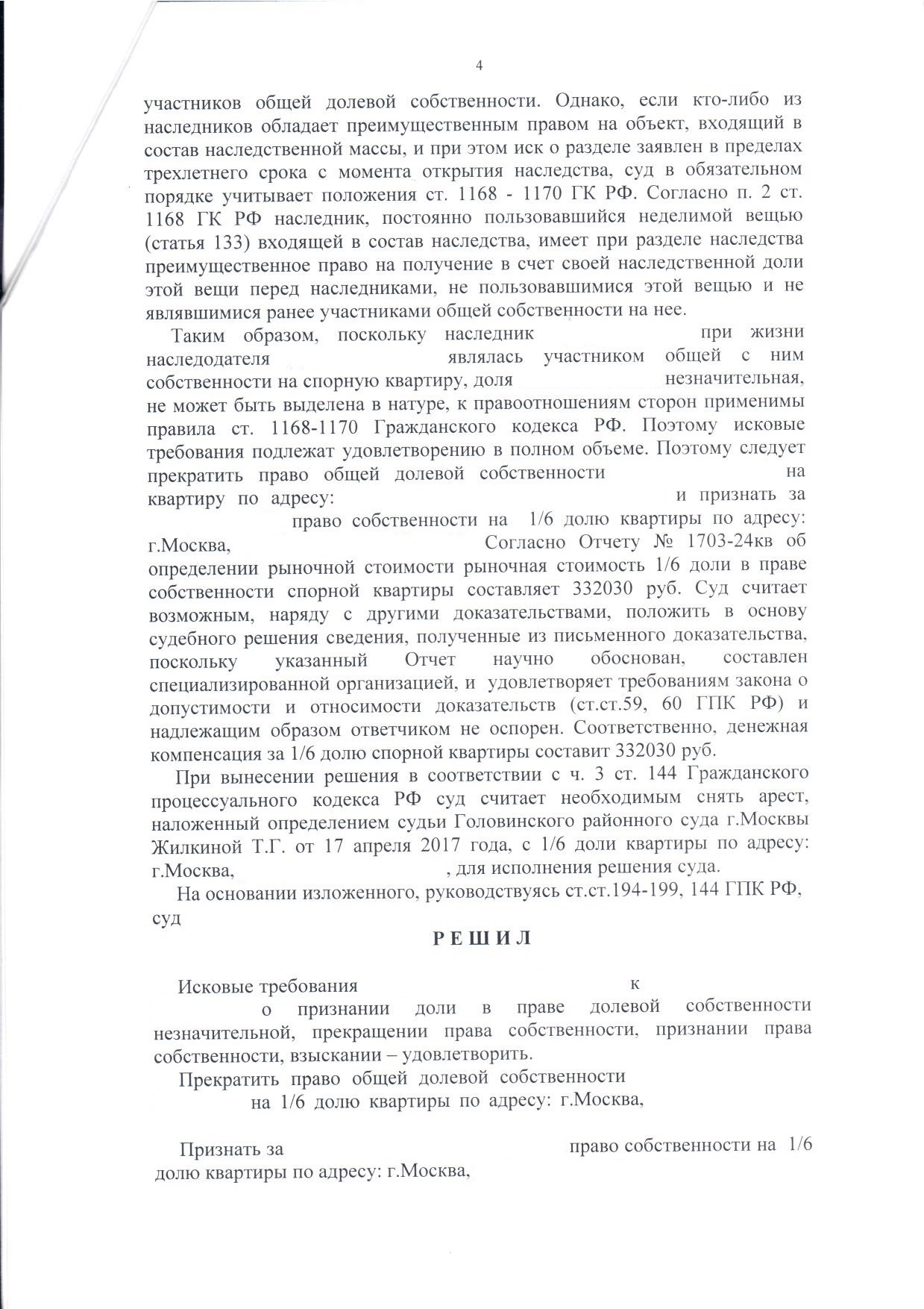 Суд удовлетворил иск. Он прекратил право собственности сестры истца на долю квартиры, признал ее незначительной с выплатой компенсации сестре, признал право на нее за истцом.