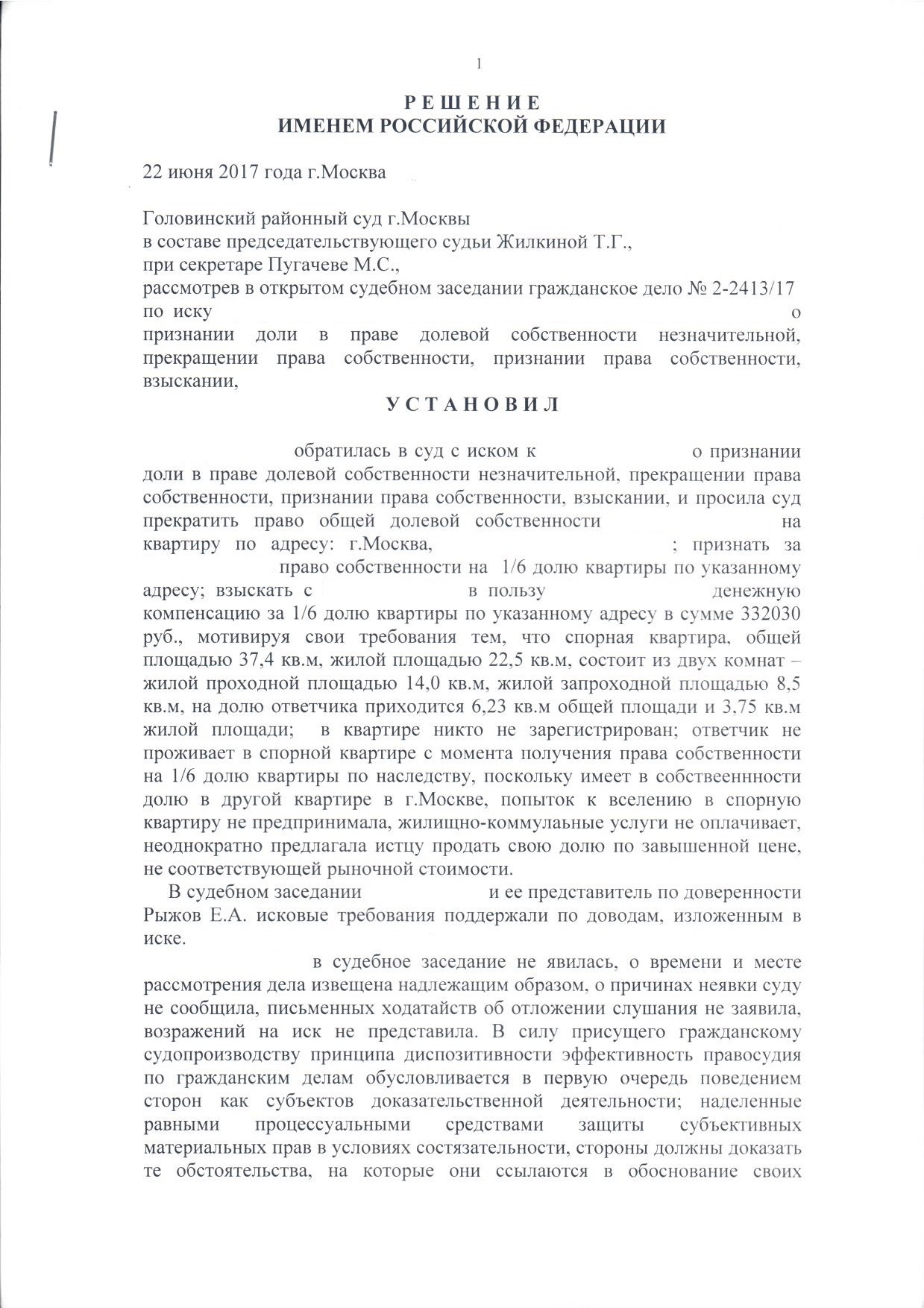 За правовой помощью к юристу Рыжову Е.А. обратилась гр. Б.Т.И., которой необходимо было признать долю своей сестры в праве общей долевой собственности незначительной, прекратить ее право собственности на долю квартиры, доставшейся по наследству.