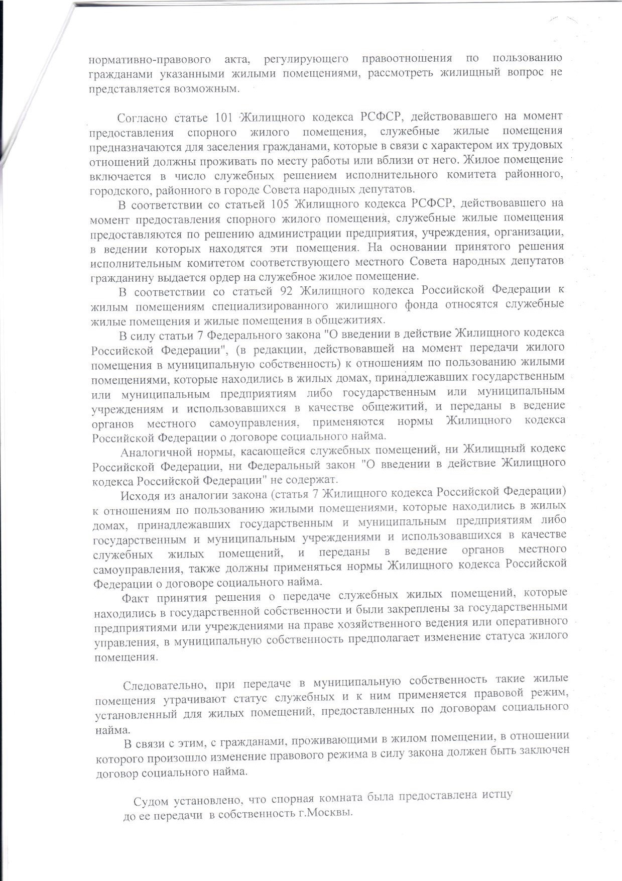 За правовой помощью к юристу Рыжову Е.А. обратилась Л.О.В., которая вместе с семьей на законных основаниях проживали в спорном жилом помещении, обратились в ДГИ г. Москвы по вопросу заключения договора социального найма, на что получили необоснованный отказ по причине невозможности заключить договор социального найма с гражданами, которым ранее предоставлены квартиры в качестве служебных или по договорам субаренды.