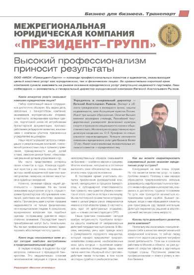 Межрегиональная юридическая компания «Президент-Групп» - инструмент успешного управления бизнесом. Компания состоит из команды профессиональных юристов и адвокатов способных решать операционные и стратегические задачи с помощью проверенных и эффективных технологий, применяемых в нашей внутренней и внешней деятельности.