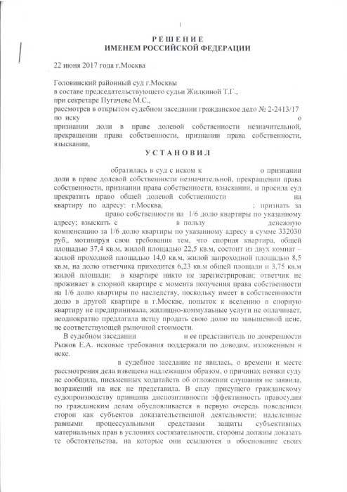 Для начала Рыжов Е.А. собрал доказательную базу в обосновании требований истца, правильно сформулировал исковые требования по делу, исходя из сложившейся судебной практики, решил прекратить право собственности на долю квартиры сестры, признать долю спорной квартиры за истцом и выплатить сестре денежную компенсацию за долю квартиры по рыночной цене. С учетом письменных доказательств, расчета рыночной стоимости доли квартиры, положения денежных средств на депозит суда в качестве серьезности намерений истца, юристу удалось склонить суд на свою сторону. Юрист верно определил нормы материального права, на которые ссылался в своем иске, а именно на ст. ст. 1168-1170 ГК РФ.