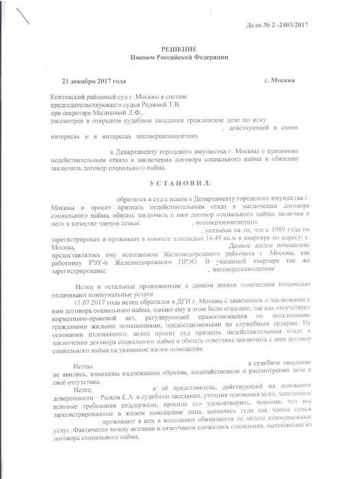 Суд удовлетворил иск. Он обязал ДГИ г. Москвы заключить договор социального найма с нанимателем квартиры, включив в него членов семьи.