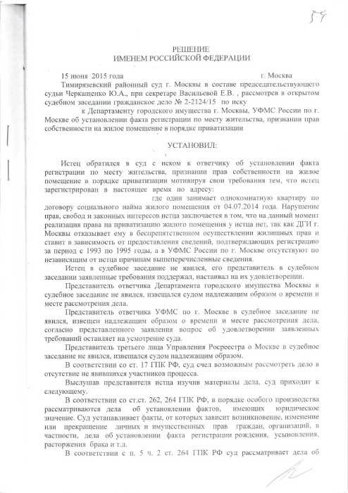 Для начала Рыжов Е.А. собрал всю доказательную базу в обосновании требований своего доверителя, потребовал установить в соответствии со ст. 264 ГПК РФ факт регистрации гр. по месту жительства в г. Москве и признать за истцом право собственности на занимаемое жилое помещение. Истец проживал в спорном жилом помещении на основании договора социального найма, ранее участия в приватизации жилых помещений не принимал, в юридически значимый период проходил службу в органах внутренних дел. Поэтому в настоящее время нет никаких препятствий к приватизации данного объекта со стороны Федерального законодательства. Статья 35 Конституции РФ декларирует, что каждый гражданин вправе иметь в собственности имущество. С целью создания в России класса собственников, государство приняло закон о приватизации жилищного фонда. В соответствии со ст. 11 данного нормативного акта, гражданин может один раз бесплатно приватизировать в собственность жилье из государственного или муниципального фонда. Статья 2 этого же закона устанавливает, что гражданин, занимающий жилье на основе договора социального найма, вправе получить его в собственность.