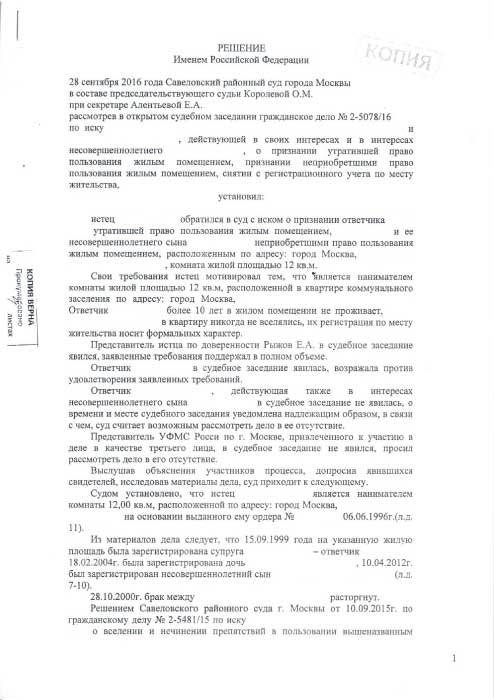 Для начала Рыжов Е.А. собрал доказательную базу в обосновании требований истца, правильно сформулировал исковые требования по делу, исходя из сложившейся судебной практики, решил признать жену бывшую утратившей право пользования жилым помещением, а дочь и внука признать неприобретшими право пользования спорным жилым помещением. С учетом письменных доказательств, показаний свидетелей соседей, юристу удалось склонить суд на свою сторону и выселить бывших родственников истца. Бывшая жена длительное время не проживала в жилом помещении, там проживал ее сын, который систематически нарушал права соседей. Дочь и внук никогда в комнату не вселялись, проживали по другому адресу. Юрист верно определил нормы материального права, на которые ссылался в своем иске, а именно на ч.2 ст. 1, ч.3 ст. 83 ЖК РФ.
