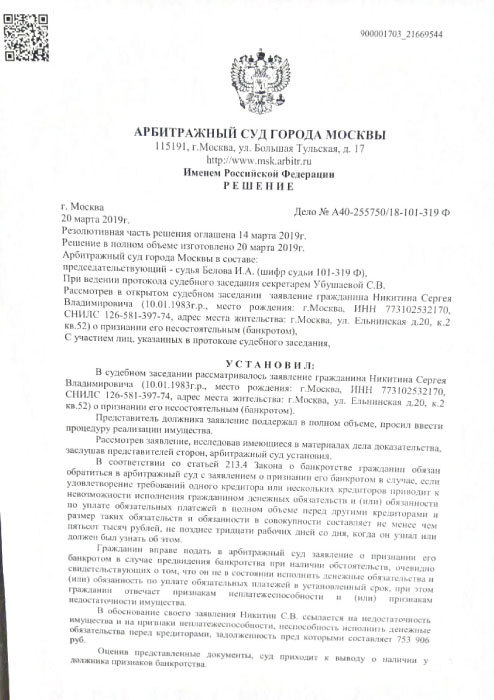 Представитель Рыжов Е.А. подготовил все необходимые документы и в кратчайшие сроки обратился в Арбитражный суд города Москвы с заявлением о признании должника несостоятельным (банкротом).